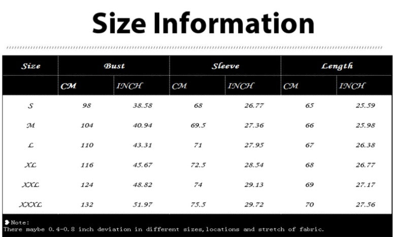 Sizes: S, M, L, XL, XXL, XXXL